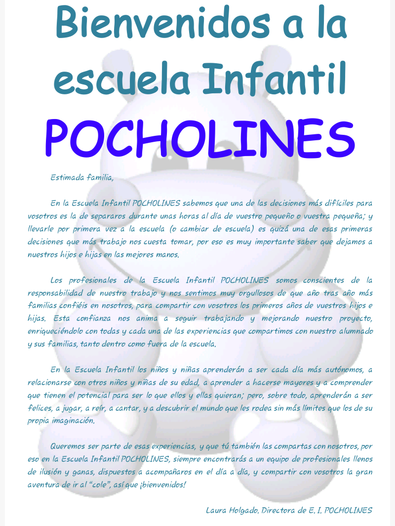 La Escuela Infantil Privada POCHOLINES es un centro educativo autorizado por la Consejería de Educación de la Comunidad de Madrid con Nº de autorización: 28072685